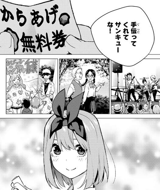 他のお手伝い、お化け屋敷やからあげ屋のお手伝いでも感謝され、四葉は満足そうな笑みを浮かべながら学園祭を満喫している人たちを見つめています。すると、限界に来ている風太郎を四葉は発見します。