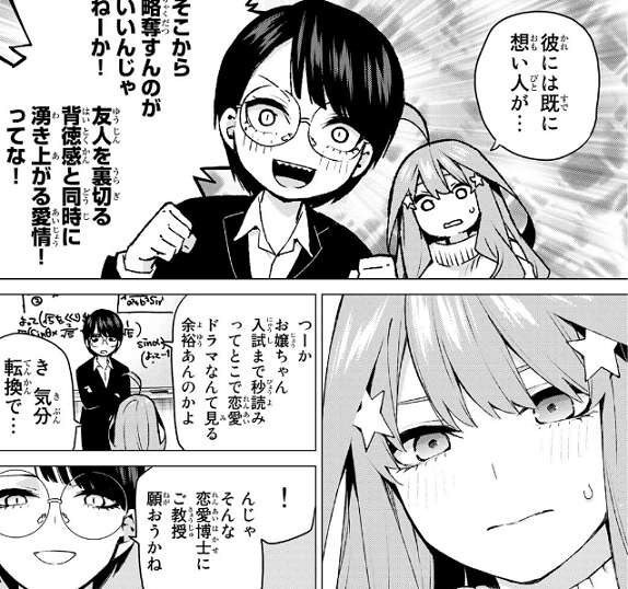 今まで恋愛描写が少なかった五月ですが、下田への悩み相談からモヤモヤしているのは男が好きだからと言われて、風太郎を意識し始めます。今さら引っ掻き回すような真似はしないと決意しますが、その後風太郎と、四葉と、二乃と会ってしまい、五月の思惑とは逆方向に進んでしまいます。四葉に対しての二乃の厳しい言葉で、四人が話していた進路の話は強制的に終了となり、最後は四葉と二乃の話し合いを風太郎と聞いてしまう形になります。五月や風太郎がいることがバレれば、さらに衝突してしまいそうです。
