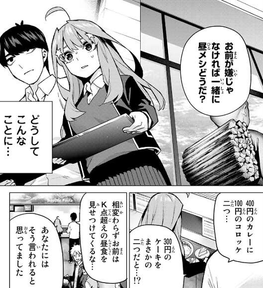 五月はカレーにコロッケ二つ、さらにケーキも二つ注文し、風太郎から相変わらずのK点越えの昼食を見せつけてくるなと言われます。しかし、ケーキの内の一つは風太郎へお祝いの気持ちを込めてあげる分だったようで、自分の分は900円だから小食と言って差し支えありませんと言い張ります。
