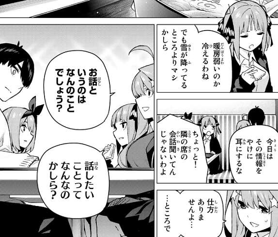 二乃も内心は動揺しているのか、四葉や五月と同じようにまずは雪が降っているところよりマシというお天気ニュースの話をしますが、風太郎から今日はその情報をやけに耳にするとツッコまれます。その後、二乃は四葉に、五月は風太郎に話は何かと同時に質問します。