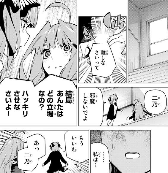 五月に強引に連れていかれた二乃は、五月に怒り立場をはっきりさせるように言います。五月がすぐに答えられずにいると、二乃は五月をおいてどこかに行ってしまいます。