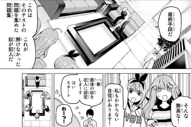 最終的に風太郎は問題集を解けなかった人が犯人とします。五つ子は抗議しますが、問答無用でスタートします。