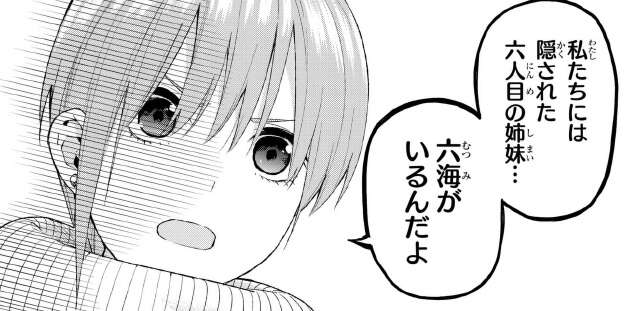 ところが一花は五つ子には隠された六人目の姉妹がいると言い出しました。「六海は今どこに」と四葉は言っていますが、一花の冗談です。
