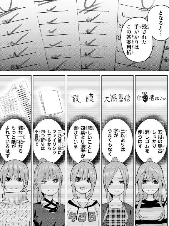 しかし風太郎には犯人だとばれてしまいます。いままでさんざん勉強を見てきて五つ子の文字は嫌という程見てきています。
