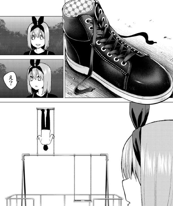 風太郎も対抗してジャンプしようとしますが、靴が脱げてジャンプするはずだった風太郎はすごい状態でブランコにいます。四葉はびっくりしますが、ありえない状況がうけたようで大爆笑します。