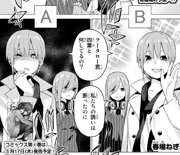前回、一花と三玖の休日デートのお誘いを断って結果的に四葉とデートをしていると一花と三玖に出くわしてしまいます。まだ見つかっていませんが、もし見つかったら何と言われるか分かりません。