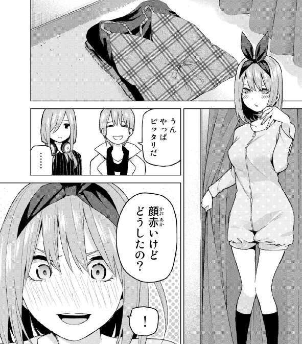 そして一花から試着室を使わせて欲しいと言われて完全に逃れられなくなりました。一花は二乃が欲しがっていたルームウェアのサイズを測りたいと言います。四葉は二乃本人でないと測れないと言いますが、五つ子達は同じ体なので誰が測っても同じだと言います。そこで風太郎が四葉の代わりに「同じ体なら私が着るよ」と言い、風太郎が見つかる事を回避しようとします。赤面する四葉です。