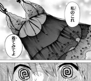 さらに一花から次はこっちを着てみてと言われます。四葉にはかなりハードルが高いセクシーな下着です。これも風太郎の前で着替えたようです。