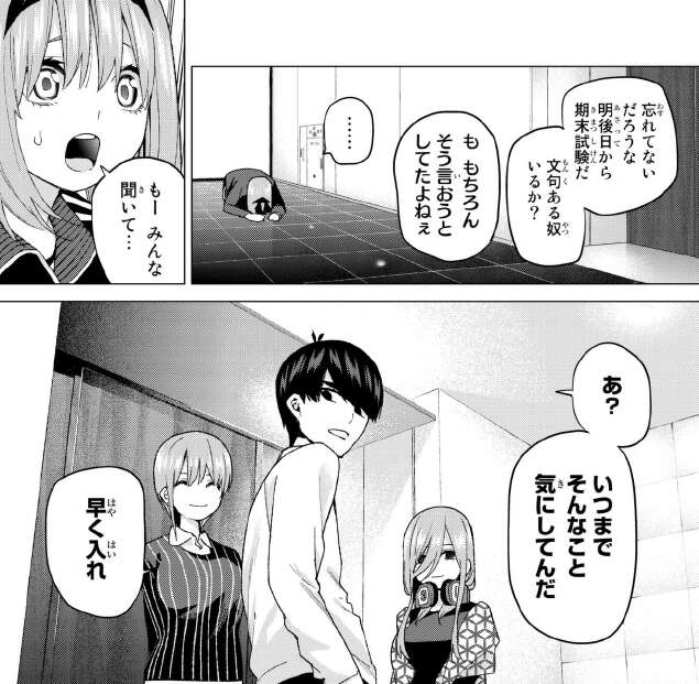 家庭教師は辞めてしまいましたが、五つ子達に期末試験を頑張るように願う風太郎です。