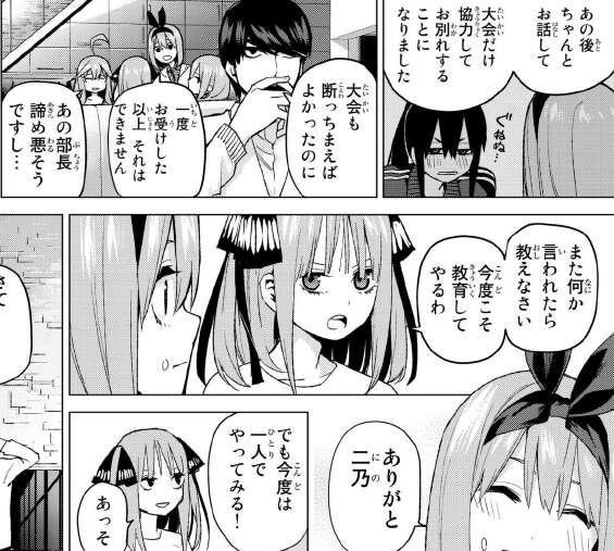 四葉の陸上部合宿参加は、二乃のおかげで参加しなくてもよくなり、四葉土下座しています。