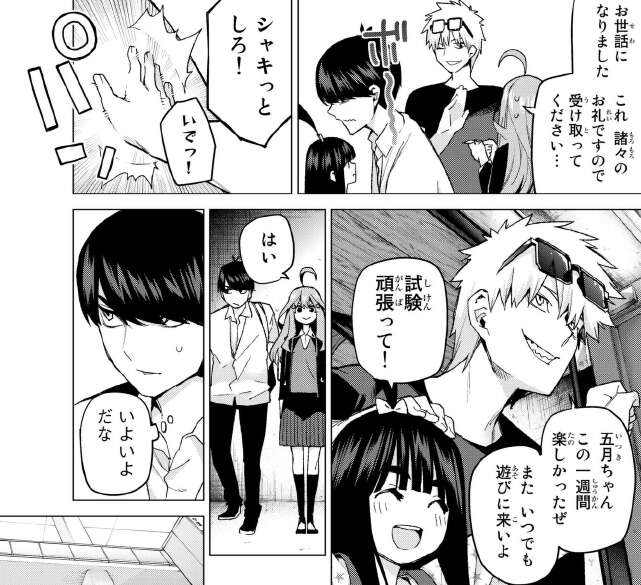 ここで父親に一度、自信で五つ子達に勉強を教えてはどうでしょうかと提案します。が、父親は忙しいと冷たく、二乃と五月が喧嘩して家を出た事も興味が無い様子です。