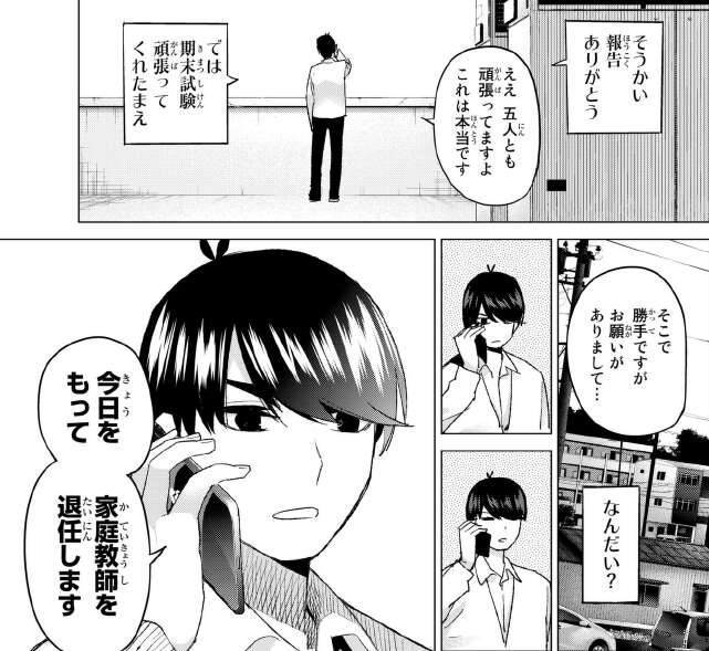 ここで風太郎、唐突に五つ子達の父親に家庭教師の退任を願い出ます。