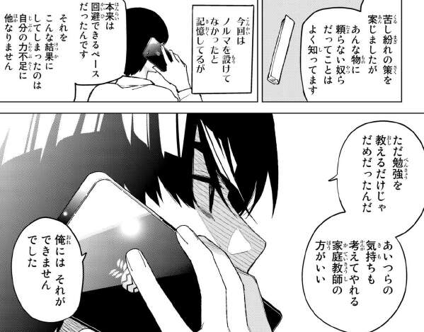 今回は赤点のノルマは結局設けていなかったようです。が、風太郎的には赤点を回避できるペースだったのが、力不足でまだ赤点を回避出来なさそうなので、辞退するようです。風太郎の申し出に、五つ子の父親はあっさりと了承します。
