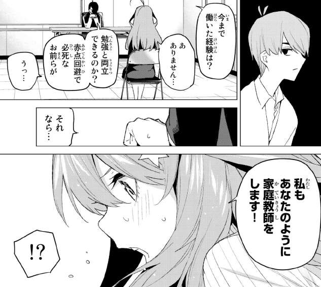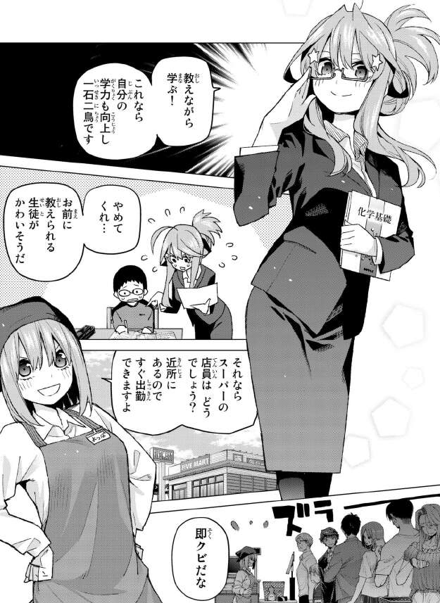 しかし4人とも希望のバイトを言いますが、どれもうまくいきそうにありません。五月は家庭教師を、四葉はスーパーの店員を希望しますが、風太郎から則クビと言われてしまいます。