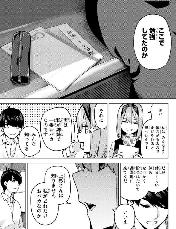 落第したのは四葉一人だけでしたが、以前言っていた五人でいる事が重要と言っていた通り、全員で転校して来たようです。四葉は今度こそみんなの足を引っ張りたくないと、少しでも勉強させてほしいと言い、風太郎も残り半周だけなら、と勉強を教えます。