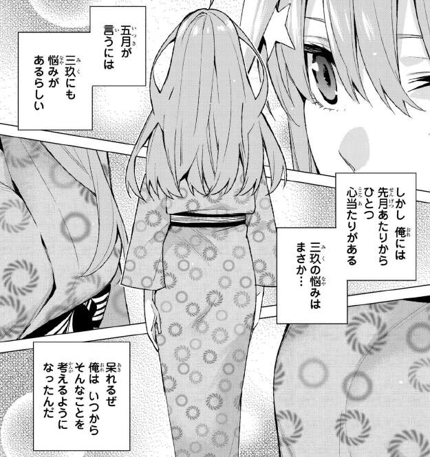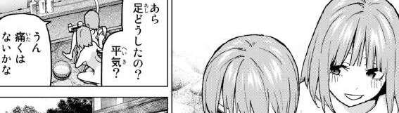 そして、一花と二乃が温泉で話している時に一花の足を心配していたので、ミスリードでなければ偽五月は一花かな。さらに二乃の口から「好きな人ができたの」発言が飛び出します。二乃の告白現場を目撃している一花は、気が気でないですね。