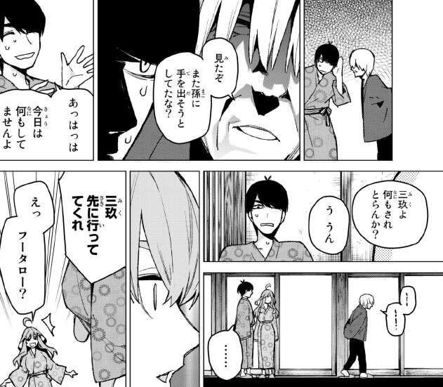 そこにお爺ちゃんが現れて、風太郎にまた孫に手を出そうとしていたな、と警告されます。今回は三玖が否定してくれて手を出されませんでした。ここで、風太郎は変装した三玖を一目で判別したのを見て、お爺ちゃんに何かお願いをします。