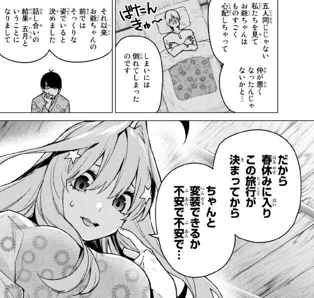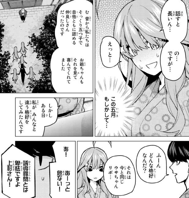 昔は五人とも同じ恰好で仲が良かったのが、五人が同じじゃない姿を見てお爺ちゃんは仲が悪くなったと勘違いし、しまいには倒れてしまったそうです。そんなお爺ちゃんの為、五人そっくりな姿でいようと決めて、話し合いの結果五月の姿となったそうです。嘘をつくのが下手な四葉は、ちゃんと五月に変装できるか不安で不安でそれで悩んでいいたそうです。四葉が余所余所しかったのもこれが原因なので、四葉が偽五月の線はかなり薄くなりました。