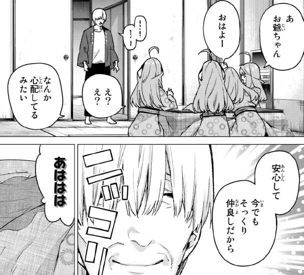 四人と一通り話して一旦、部屋に全員戻りましたが風太郎はまだ見分けられていません。そこにお爺ちゃんが不意に部屋に入ってきて、五つ子たちに様子を見に来ました。孫たちの仲の良い様子を見て安心するお爺ちゃん。