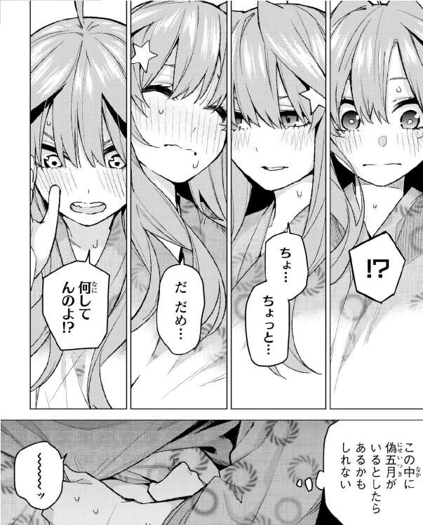 この場面での五月の中身は三玖だと分かりますが、外見からではさっぱり見分けがつかず諦めかけますが、前回63話の温泉での五月の「愛があれば!」の言葉を思い出し、再度よく観察します。しかし三玖からは、いやらしい視線と感じられてしまいます。