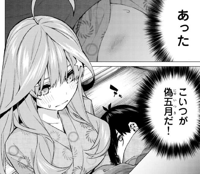 偽五月をゲームで特定しようと、風太郎は質問したり後姿を観察しまくったりとしますが、偽五月を特定できません。風太郎の愛が足りないのでしょう。結局、コタツの中で、偽五月の足には怪我がある事だけ確認します。
