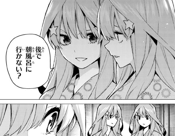 その後、なんとかお爺ちゃんをやり過ごし五月以外の四人は一旦バラバラになりますが、二乃は一花に朝風呂に行こうと誘います。誘っている方が二乃で、誘われている方が一花です。