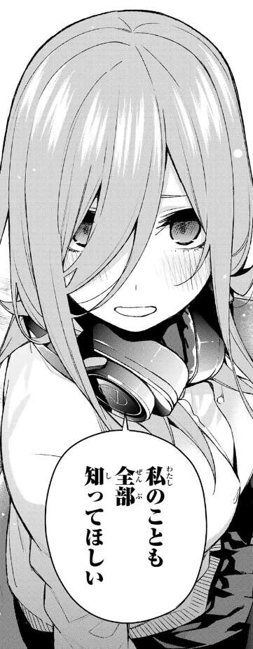 三玖は正直に私頑張ったよ、と言うと風太郎は自分の昔のことを話し始めます。風太郎は母親が作ってくれていたパンが大好きで、六歳の頃に死ぬまでパンを毎日作っていたことを今思い出したと話します。俺の話は今どうでもいいかと風太郎は話を止めようとしますが、三玖は風太郎の事をもっと知りたい、そして自分の事も全部知ってほしいと言います。