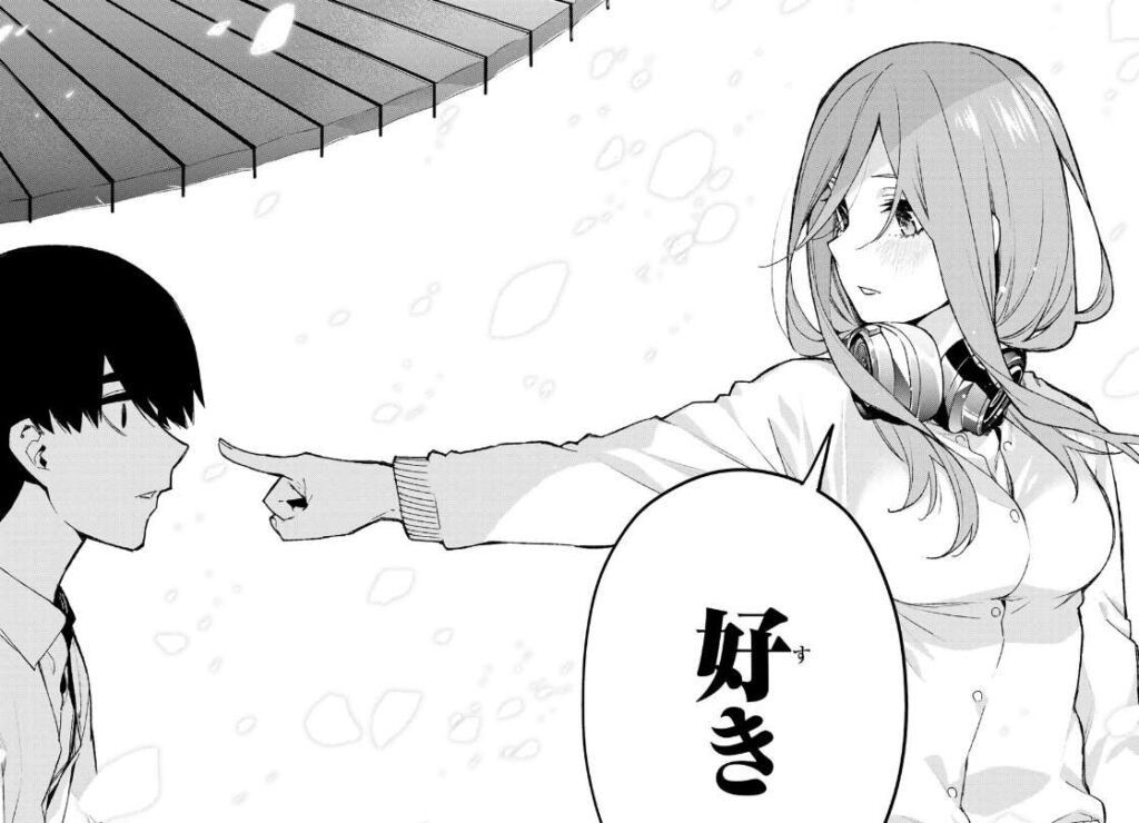 最後に三玖が指差したのは風太郎で、風太郎に好きだと正面から告白します。82話でそんな自信は湧いてこないと泣いていた三玖ですが、今回はちゃんと告白できました。