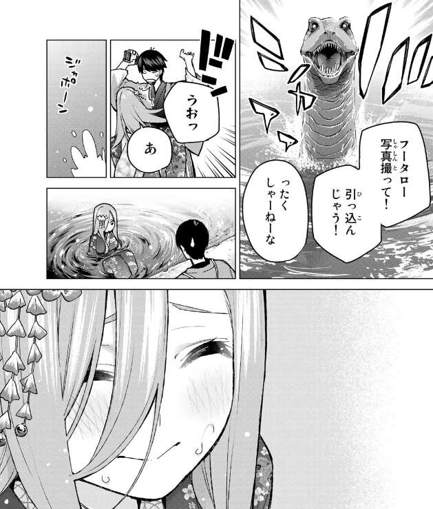 二人で前田と武田を捜しつつ、鎧武者と写真と撮ったり射的を楽しんだりと映画村を二人で満喫します。そして池から恐竜が出てくる場所で写真を撮ろうとしますが、風太郎は誰かに押されてしまい、それが原因で三玖が池に落ちてしまいます。