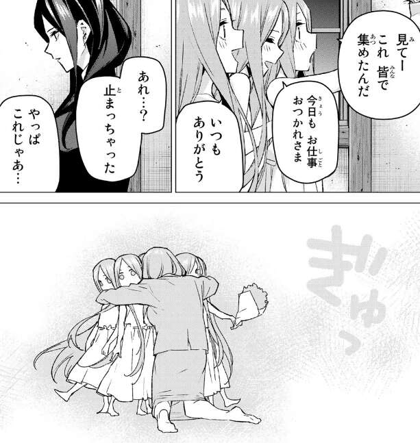 母親も娘たちからのお花のプレゼントに感動し、五人を抱きしめて、こちらこそありがとうと感謝の言葉を言います。場面変わって6月、修学旅行に行く朝ですが、五月は母親と離れるのが嫌で、いつまでも母親に抱き着いています。一花が五月を母親から話して連れて行っていると、後に再婚する男性が立っています。