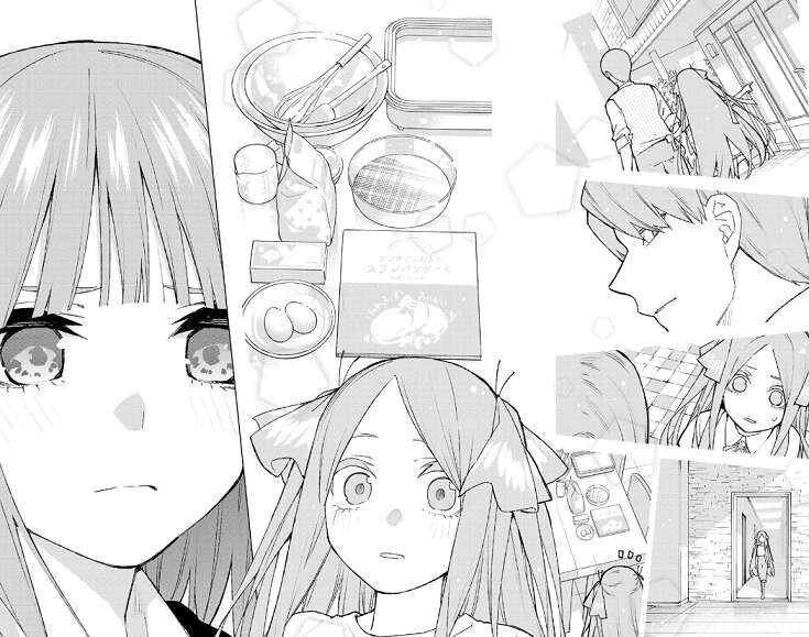 それを聞いた二乃は幼い頃、パンケーキのお店に連れていってもらえなかった時の頃を思い出します。がっかりしますがその後、父親は二乃にパンケーキを作る道具一式や、スフレパンケーキの本を用意しています。その時の事を思い出し、二乃は父親に招待状を出すことを決意し、四葉に招待状の文面を一緒に考えて欲しいとお願いします。