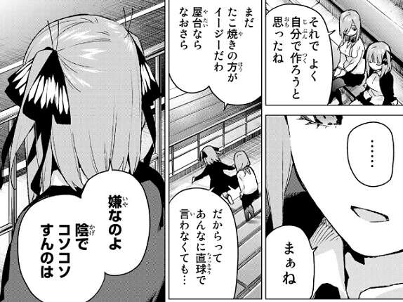 前回、学園祭に向けてクラスで屋台のメニューを話しあっていましたが、たこ焼きとパンケーキ、どちらがいいかでクラス内で対決が起きています。女子組はパンケーキを推していて、男子組はたこ焼きを推していますが、二乃と三玖が板挟みになっています。