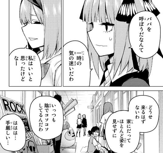 しかし女子3人からは風太郎の妄想だと思われ、ドン引きされます。その設定は二乃がかわいそうだとまで言われてしまい、風太郎は必死で妄想でないと主張しますが、無駄そうです。四葉はその場面を見て、二乃に陰でコソコソするのも何か理由があるからで悪くないよと、父親にも理由があるのだと父親をフォローします。