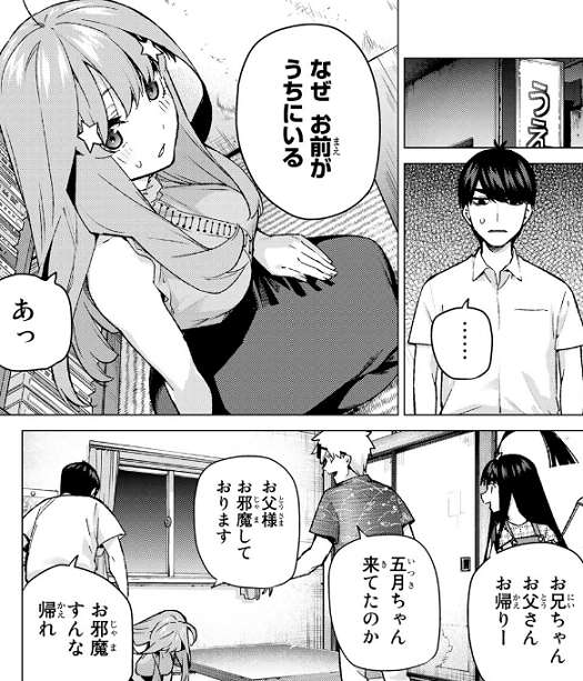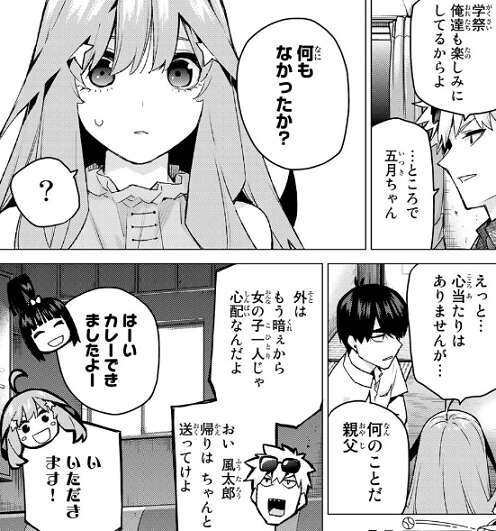 風太郎の父親が五月に何もなかったか?と質問しますが、五月は質問がよく分からず心当たりはないと答えます。風太郎は何のことか聞きますが、風太郎の父親は外はもう暗いからと、帰りはちゃんと送るように言うだけです。
