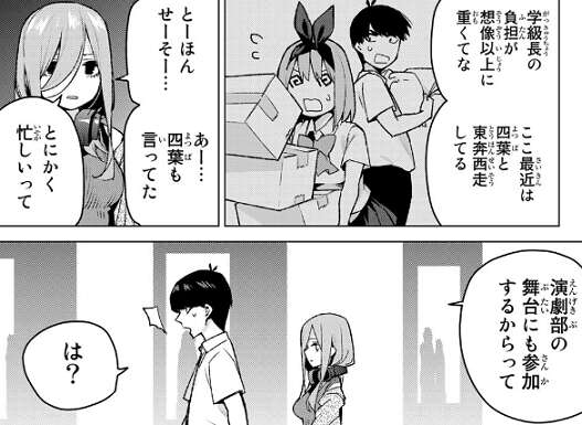 しかし学級長の負担が想像以上に重いらしく風太郎は当日クラスに顔を出せないかもと言い、最近は四葉と東奔西走しているそうです。さらに四葉が演劇部の舞台にも参加すると三玖から聞き、四葉の演技を想像して風太郎は不安になります。