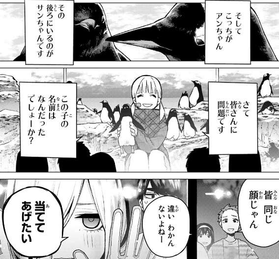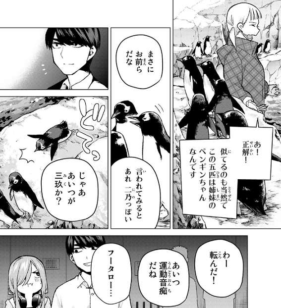 見ていた五匹のペンギンが偶然、姉妹のペンギンで三玖や風太郎はペンギンに、二乃や三玖を重ねて楽しみます。三玖はペンギンを見ながら、調理学校に行きたいと言いづらくなってしまったが、ひとまず大学に行ってからでも遅くないかもと考え始めます。風太郎と同じ大学行けるかも知れないと考えながら、風太郎を見つめていますがなかなか飛び込めなかったペンギンが、水に飛び込んだと同時に三玖も正直に自分の気持ちを話します。