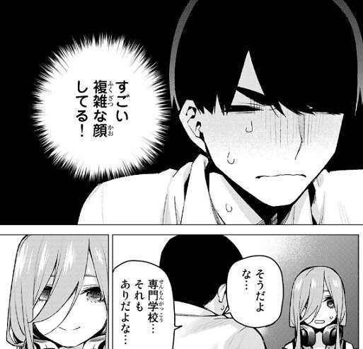 が、本心が顔に出てしまい風太郎はすごく複雑な顔をします。三玖は大学に行くのも間違いじゃないと思うとしながらも、今は自分の夢に進みたくて仕方がない、風太郎が特別な人だからそれを伝えたかったと言います。