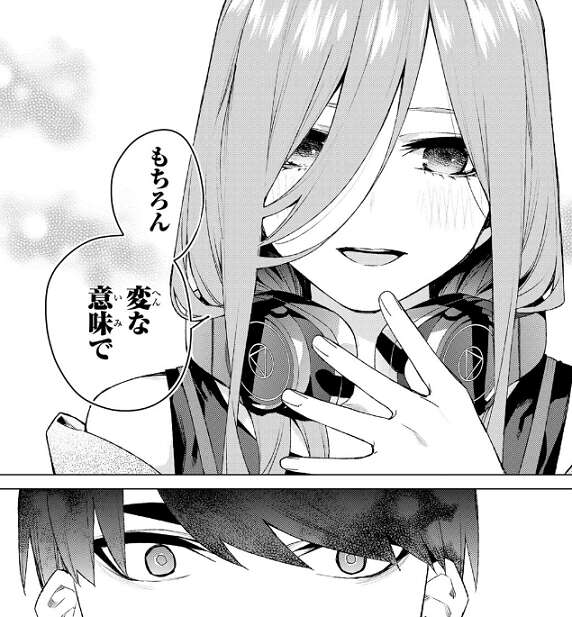風太郎は特別な人という言葉に反応して聞き返しますが、三玖はもちろん 変な意味でとストレートに表現して誤魔化したりせず告白します。そして自分は伝えて、次は風太郎の番だと三玖は言います。
