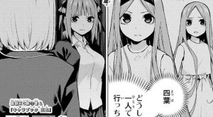 前回、五つ子たち全員が学園祭の全てが終わる頃各々の部屋で、風太郎を待つことにしましたが、風太郎は前田、武田と一緒に池の前でクラスの誰かが他のクラスの子と付き合いだした、というような話をしています。そんな話をしながら学園祭が終わってしまう寂しさを感じていると、せっかくだからいつまでもこんなところに座っていないで屋台に食いに行こうと前田が言います。風太郎も行けずじまいの店があったと賛成し、その後は会う約束をしている奴がいると話します。