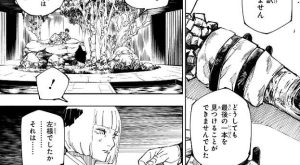 人型に変態した陀艮と対峙した直毘人は、術式「投射呪法」で陀艮の速度を圧倒し、何度も攻撃しますが陀艮の果てしない体力を前にほとんど削ることが出来ません。その後、陀艮が領域「蕩蘊平線(たううんへいせん)」を展開し、直毘人、七海、真希を圧倒します。さらに死累累湧軍(しるるゆうぐん)を使って呪術師を追い詰めようとしますが、伏黒恵が領域展開「嵌合暗翳庭(かんごうあんえいてい)」を使用して陀言の領域に侵入、さらに制御不能になった伏黒甚爾まで乱入してきます。