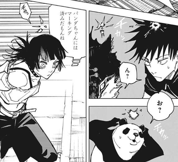 伏黒は防犯カメラの死角になる場所で見張りを倒し、パンダは愛らしさをアピールして防犯カメラの死角になる所まで見張りをおびき寄せて一気に倒します。