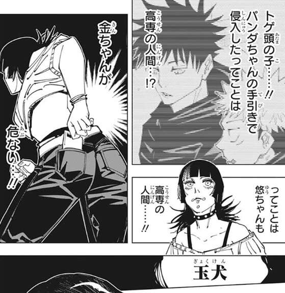一方、星綺羅羅も伏黒を見て、虎杖が伏黒と一緒に防犯カメラに映っていた事を思い出します。伏黒がパンダと一緒にいた事から、伏黒は高専の人間、そして虎杖も高専の人間だと判断します。星綺羅羅は秤が危ないと思いスマホで連絡しようとしますが、伏黒は玉犬「渾」を呼び出し、星綺羅羅を捕まえようとします。