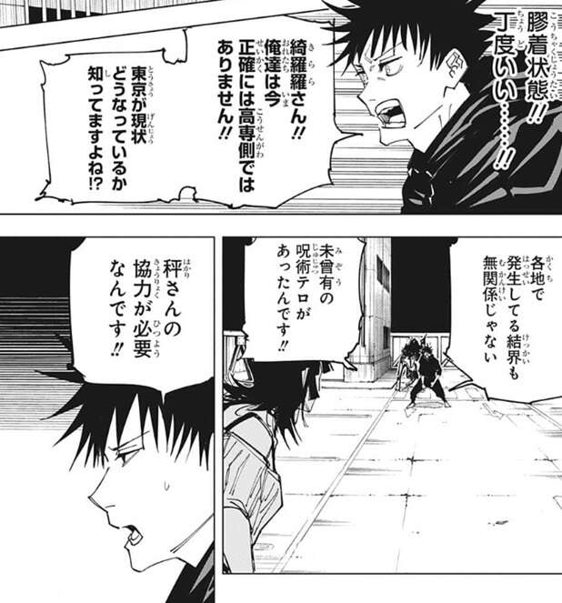 一方、星綺羅羅に近付けず膠着状態となった伏黒は、この状況を丁度いいと思い、現状を説明し星綺羅羅を説得しようとします。伏黒は、現在は正確には高専側でなく、さらに東京で未曽有の呪術テロがあった事を説明し、秤の協力が必要だと訴えます。