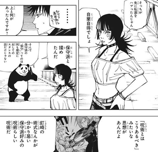 しかし星綺羅羅から、そっちが先に私達をハブったんじゃん、自業自得でしょ、と言われてしまいます。その後、パンダから秤と星綺羅羅が保守派と揉めた事を説明されます。保守派は釘崎の術式のような、分かり易い呪術らしい呪術・術式を好むようですが、秤や星綺羅羅の術式はそれとは違い、ニューテクと絡むような術式のようです。特に秤の術式はその典型のようで、その関係で保守派と揉めたようです。