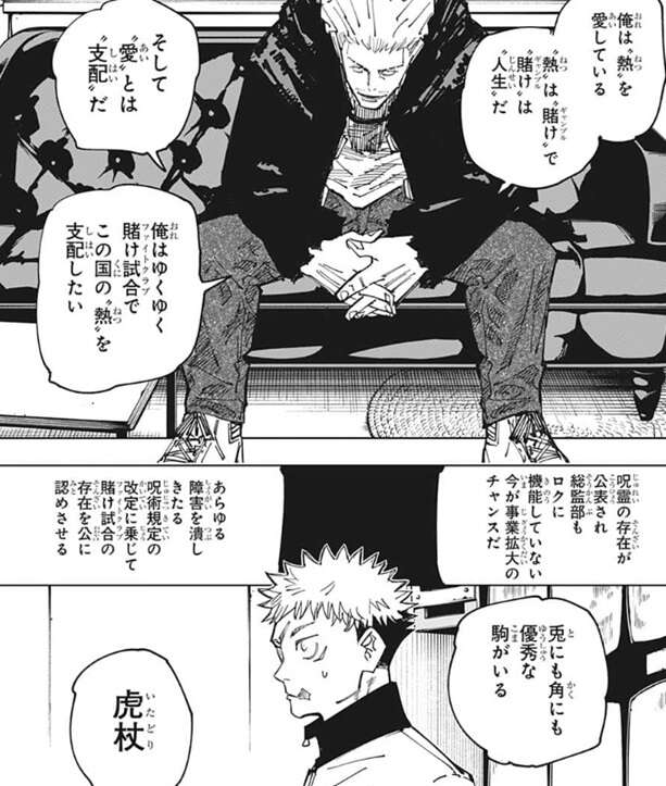 そして、よりダイレクトな“熱”のやりとり、何か分かるか?と、虎杖に質問し、虎杖はギャンブルと答えます。虎杖に、やっぱりオマエは分かっていると言い、“熱”を愛していて、“熱”は“賭け(ギャンブル)”で“賭け(ギャンブル)”は“人生”だ、そして“愛”とは“支配”だ、と秤は虎杖に語ると、俺はゆくゆく賭け試合(ファイトクラブ)でこの国の“熱”を支配したい、と願望を語ります。今後来るであろう呪術規定の改定に乗じて、秤はファイトクラブの存在を公に認めさせたいと言い、兎にも角にも優秀な駒がいると続けて言うと、虎杖を優秀な駒として誘います。