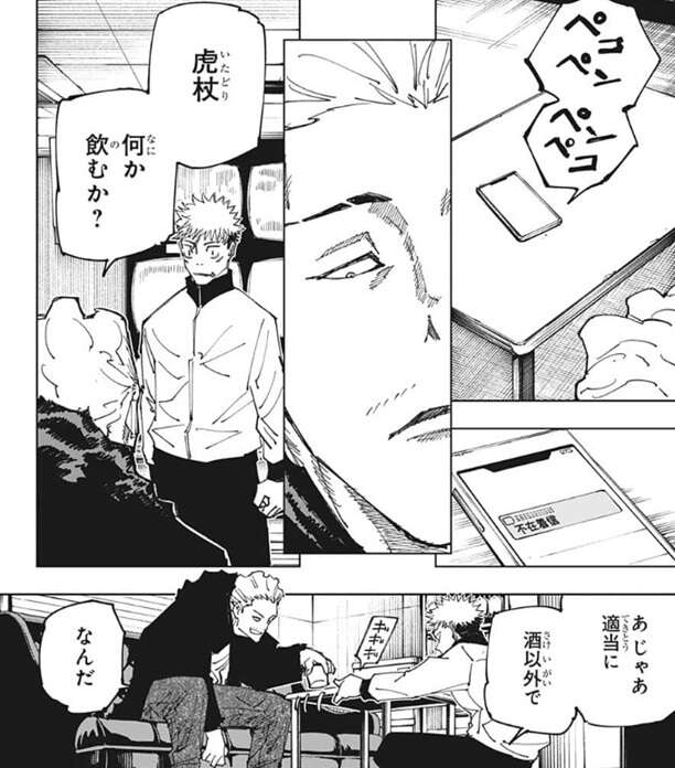 秤の誘いに対して、虎杖は相談があると話を切り出そうとしますが、それを遮るように秤のスマホが鳴り始めます。不在着信が秤のスマホの画面に表示され、秤は何か飲むかと虎杖に言います。虎杖が酒以外でと言うと、弱いのか、と秤は聞きますが、虎杖は未成年だと答えます。