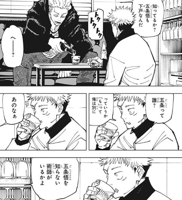 その後、知っているか?五条悟も下戸なんだ、と秤は五条悟の話題を虎杖に振ります。高専の話をする前に、高専関係者とバレると秤は話を聞いてくれなさそうなので、虎杖は五条悟を知らないふりをします。しかし、五条悟を知らない術師がいるかよ、と秤に言われてしまい、知らないフリをした事が秤にあっさりとバレてしまいます。