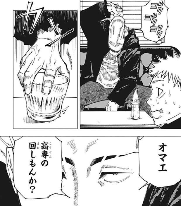 虎杖は嘘がバレると露骨に、バレた!という表情をしてしまい、言い訳出来ない状況になってしまいます。そこに、高専の回しもんか?と、秤に言われ、虎杖は弁解しようとしますが秤は話を聞こうとせず、グラスを虎杖に投げて攻撃しようとします。