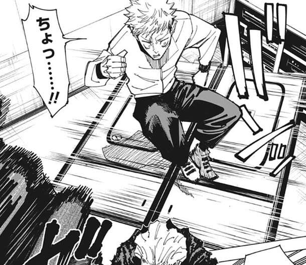電車のドアが突然現れ、虎杖はとっさに飛び上がって避けますが、そこに秤の蹴りが飛んできます。多分、この電車のドアが、秤の術式に関係しているのだと思われます。