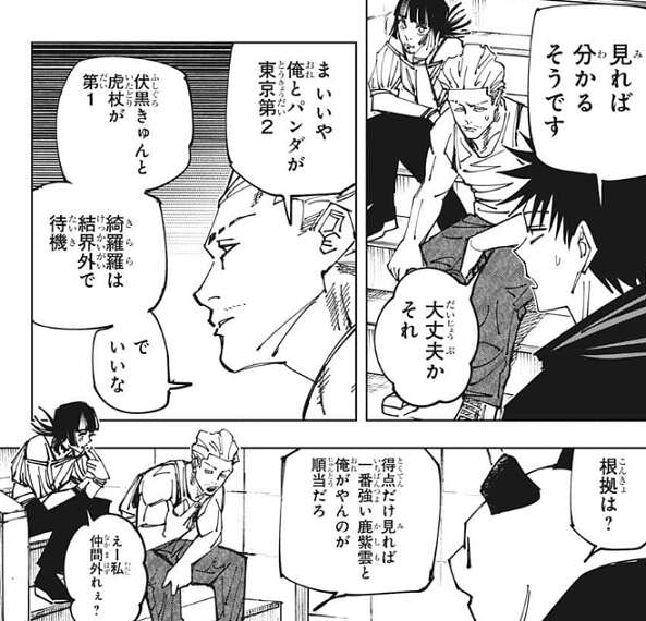 姿も見れば天使と分かる、と伏黒は秤に伝えますが、秤はそれを聞いて不安になったようで、大丈夫かそれ?と、伏黒に聞きます。そして秤の提案で、秤とパンダが東京第2結界(コロニー)へ、伏黒と虎杖が東京第1結界(コロニー)へ、綺羅羅は結界外で待機、という役割になります。秤が一番強そうな鹿紫雲一と当たるのが順当、そしてパンダは鼻が利くので天使探しに注力する、外の状況を把握できる奴がいた方がいい、という秤の根拠で役割が決定します。